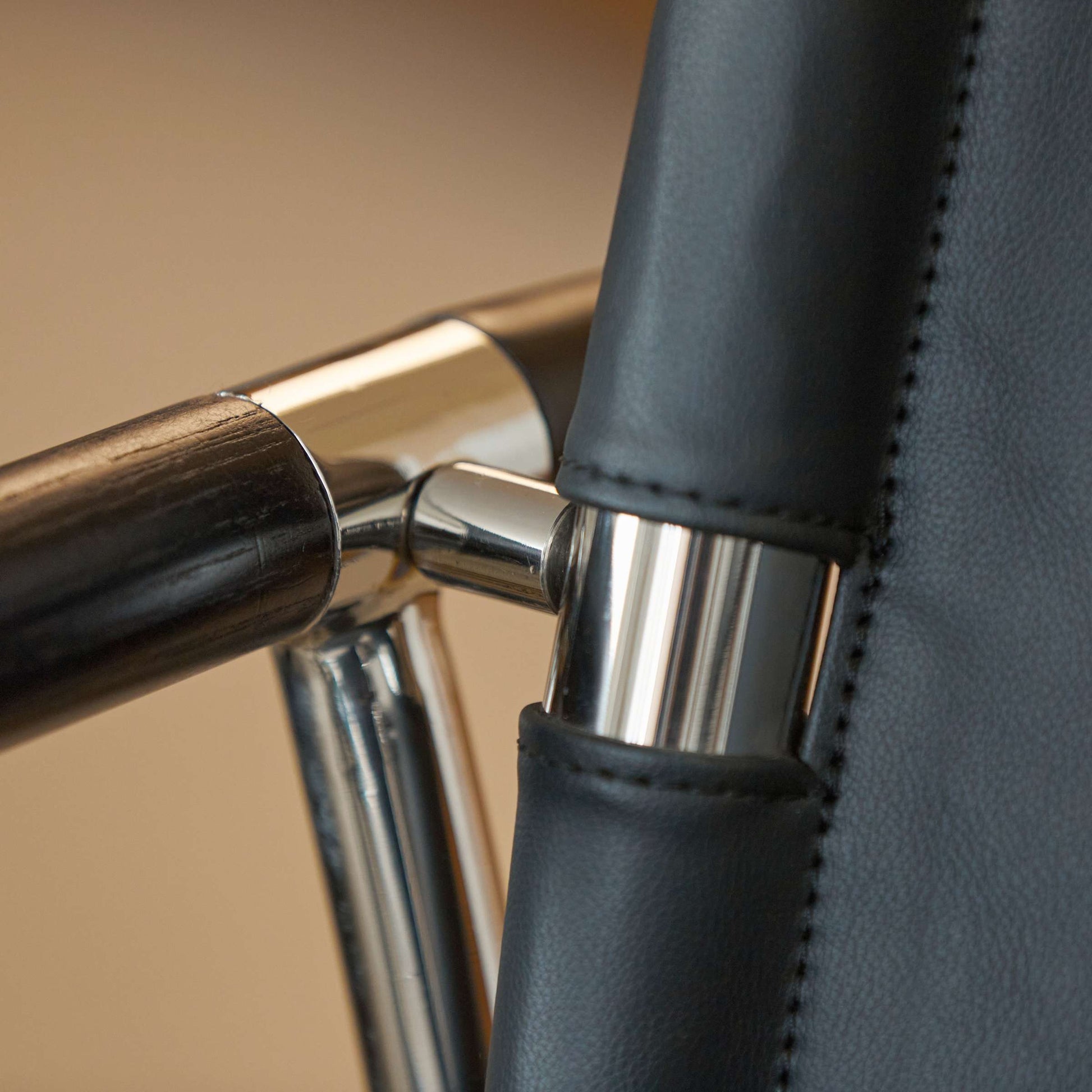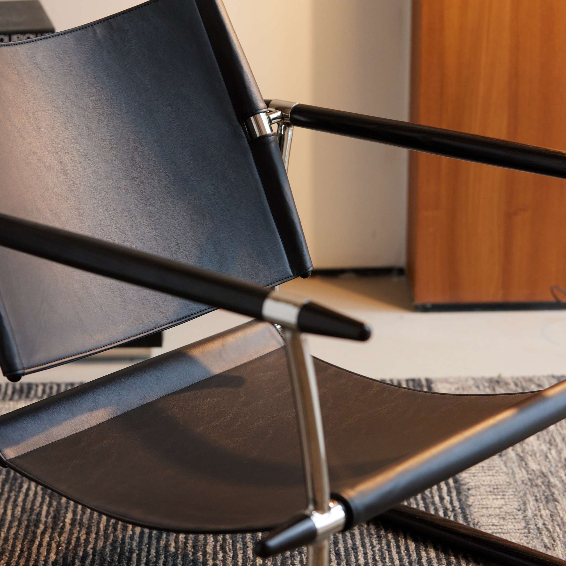 This modern and minimalist armchair features a solid wood frame and antique leather upholstery, creating a one-of-a-kind piece that blends the best of wabi-sabi and bauhaus design. Elevate your interior with a touch of personality.